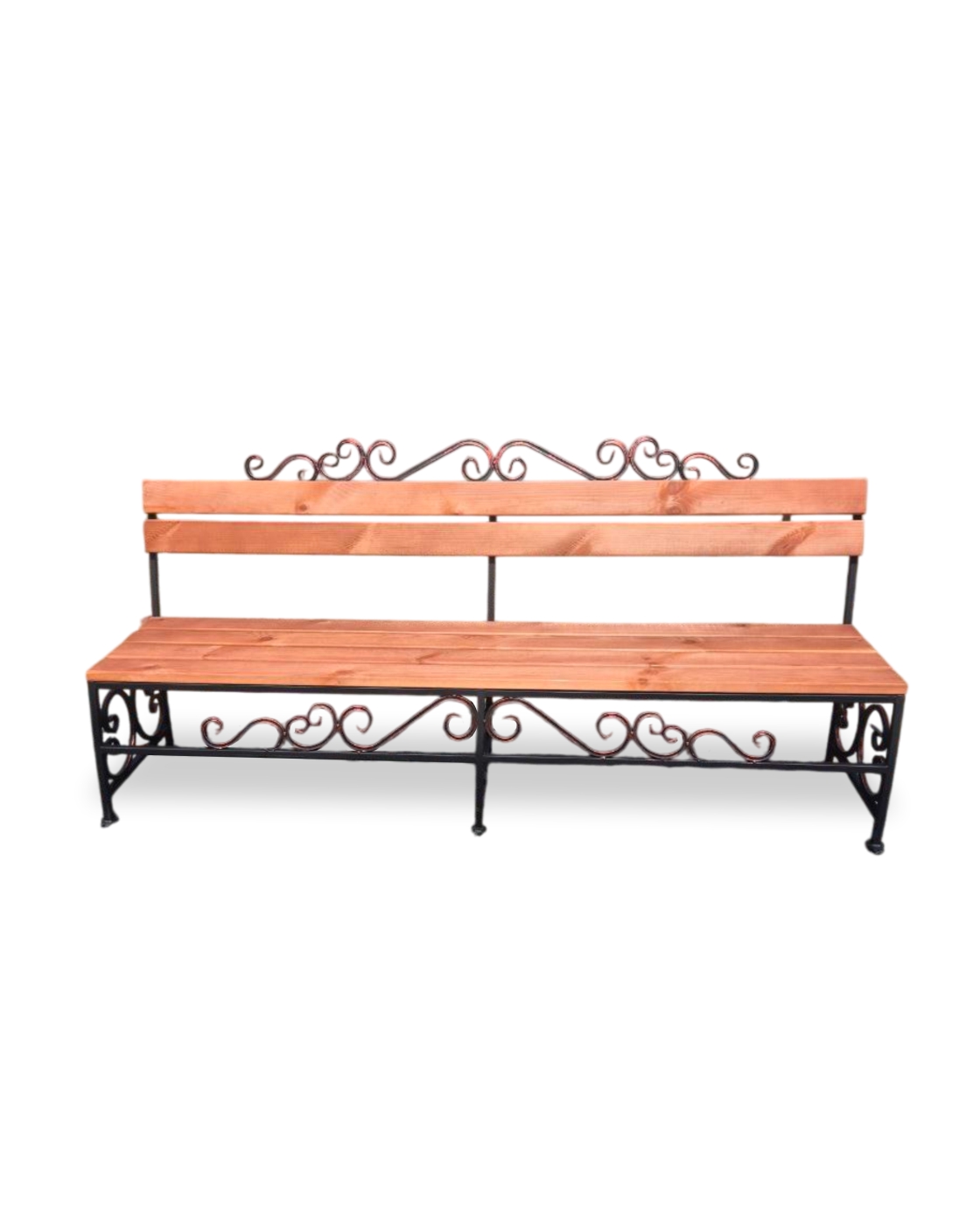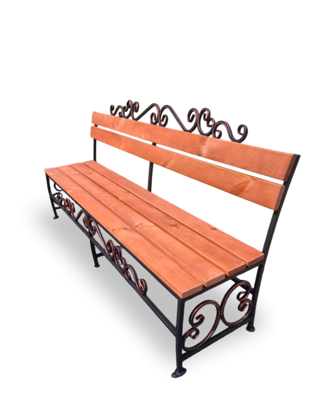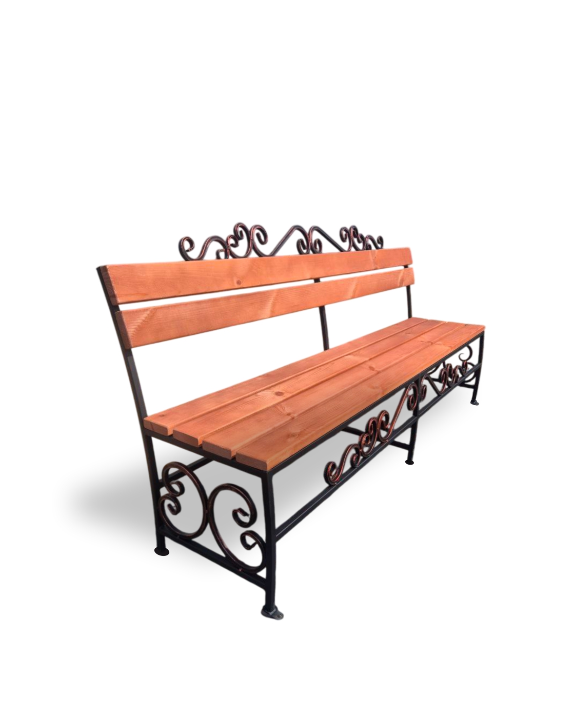 Лавка выполнена из массива сосны на кованном основании и притягивает взгляды своими декоративными элементами изящных опор. Она не займет много места и станет прекрасным дополнением экстерьера или интерьера различных архитектурных стилей, будет идеально удобна как на садовом участке, так и в уличных кафе и ресторанах.